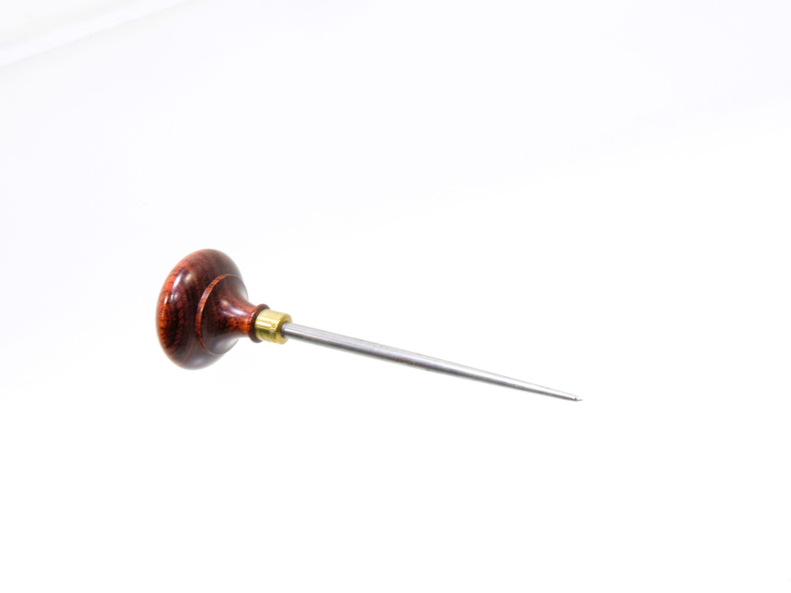 The SA-1 Scratch Awl is designed to complement its big brother, the SA-2. It is great for starting screw holes and making divots for brad point drills. The handle comes to rest in the palm of your hand, the point acting as an extension of your index finger. This immobilizes your wrist and allows you to transfer “weight” to the point. As a safety feature, the brass ferrule completely encapsulates the tang and directs all downward forces to the minor diameter of the handle.