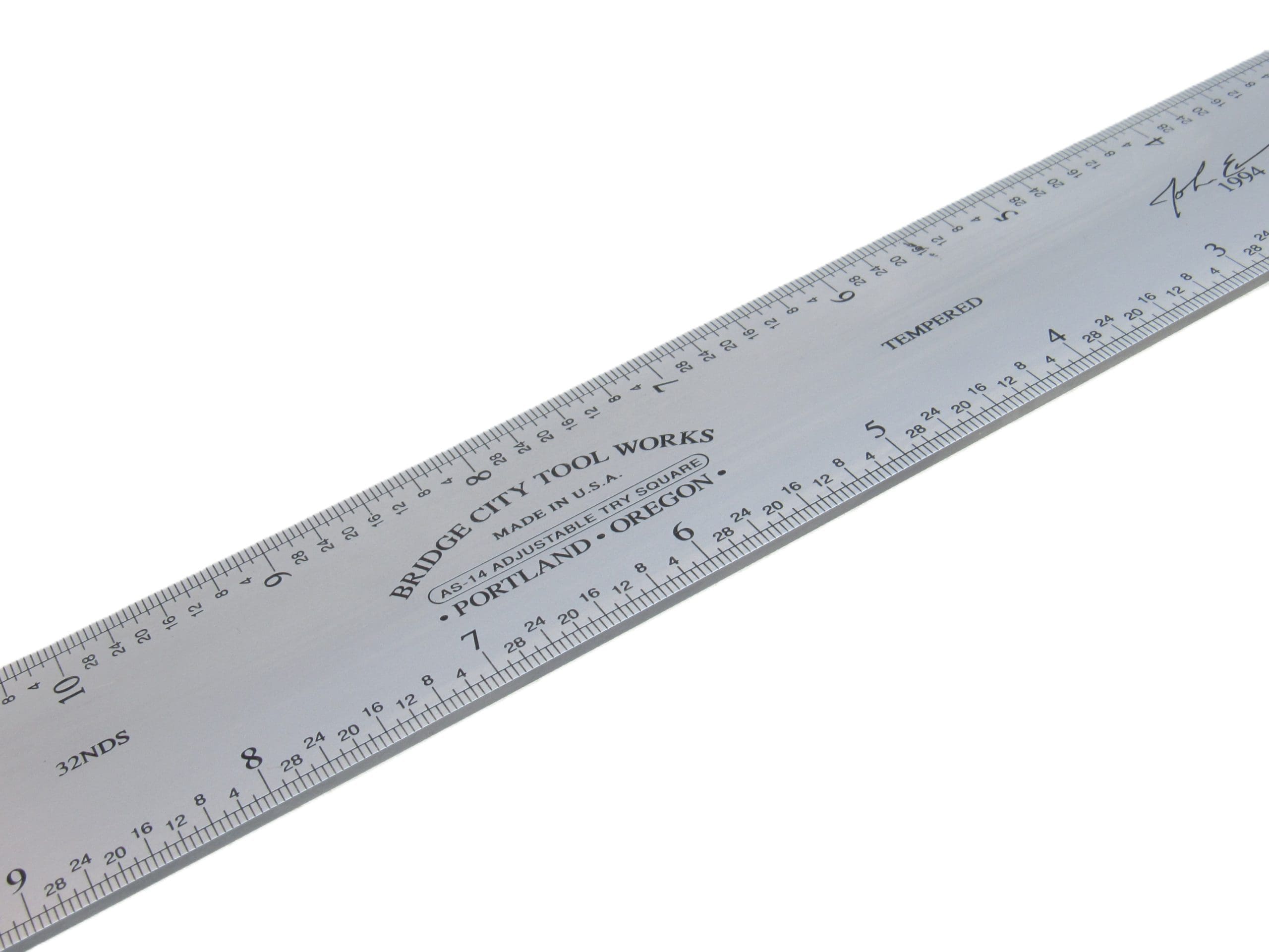 The AS-14 is a fantastic size square and allows full access of the 12″ blade on the inside rule and reads to 14″ on the outside rule. This size square will allow layout and measurement on lumber up to 12″ in width. Most important, the accuracy is plus or minus .001″ over the length of the blade, making this the most accurate square we have ever produced. In essence, this is a 12″ hook rule.