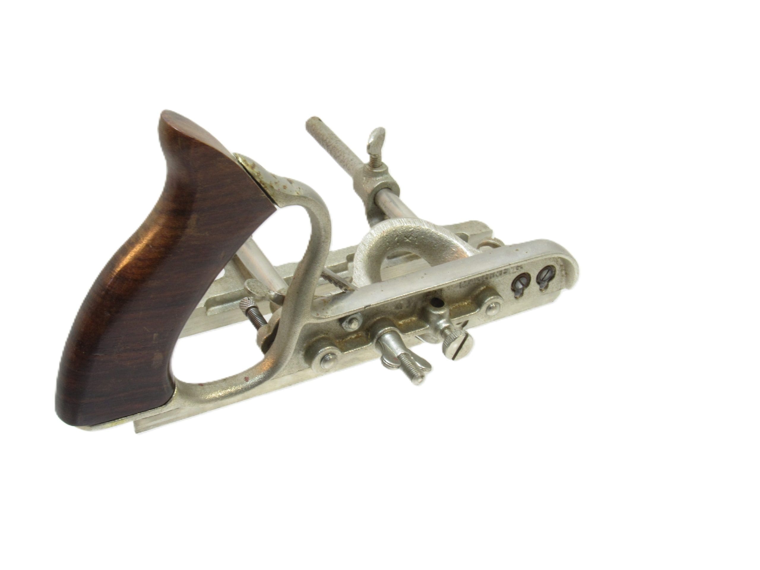 This set is complete, including the often missing chip deflector, a small but critical accessory that improves performance and is rarely found intact with these planes. The cutters are clean, the nickel plating is bright, and the adjustment mechanisms operate smoothly.