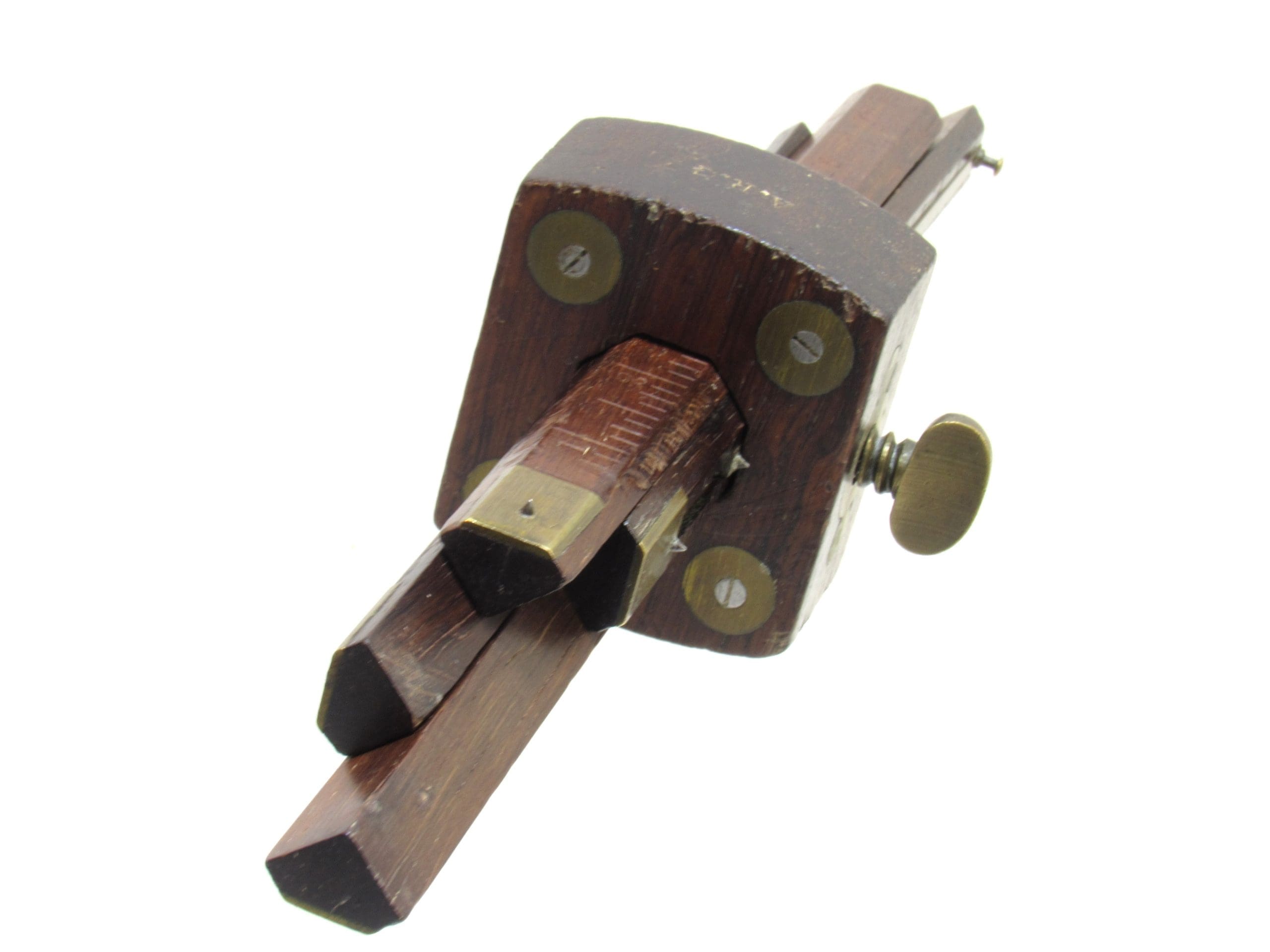 Designed for accurate mortise and layout marking, this gauge allows for three independent adjustments, making it a versatile addition to any collection or workshop. The brass fittings remain in excellent condition, complementing the rich rosewood body.