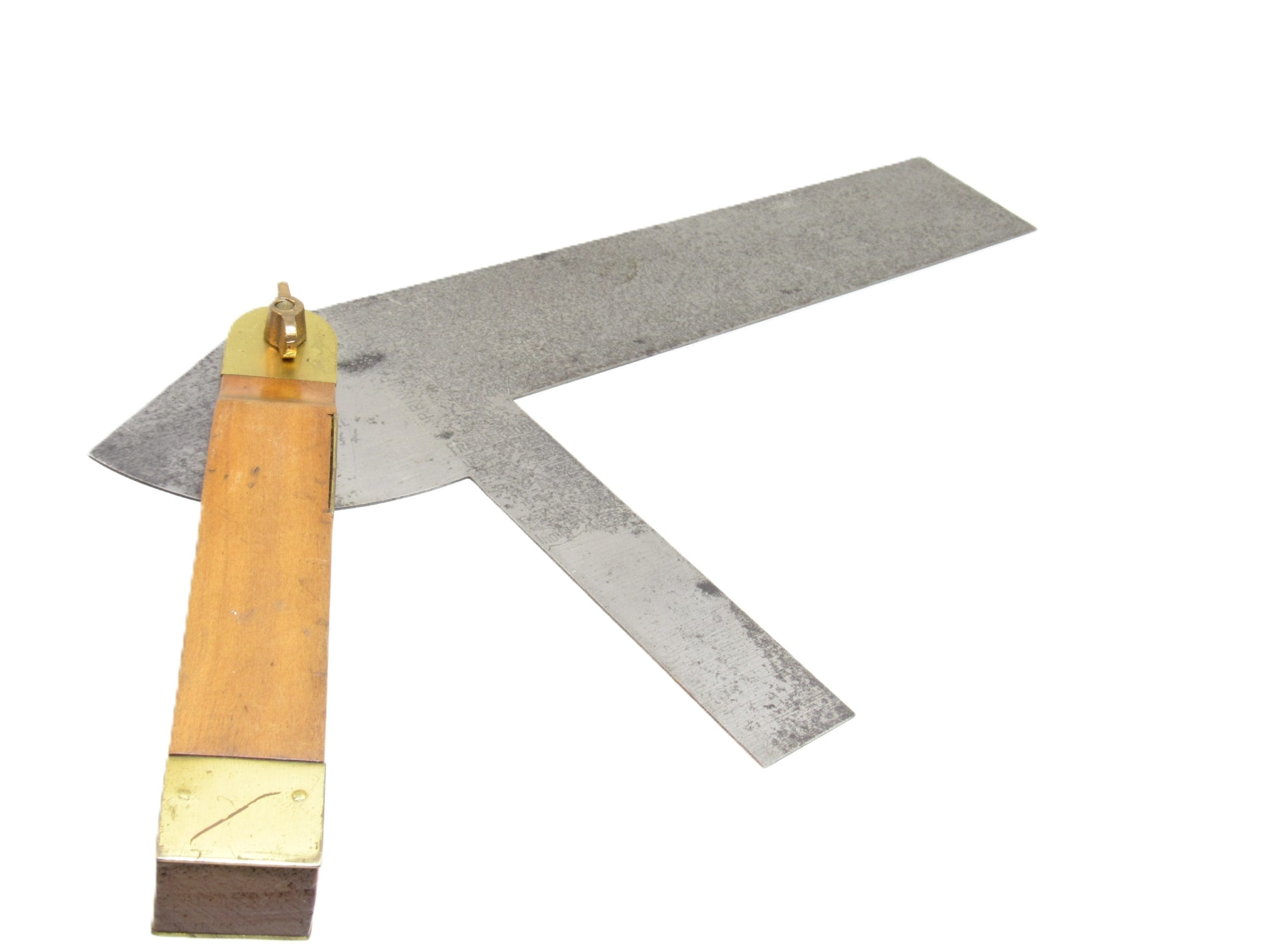 The tool features a swinging secondary blade that allows for precise rafter layout, with one blade marked with roof pitch tables and rafter length calculationsโan early and elegant solution for complex framing geometry. The stock is typically made of cherry, and survi