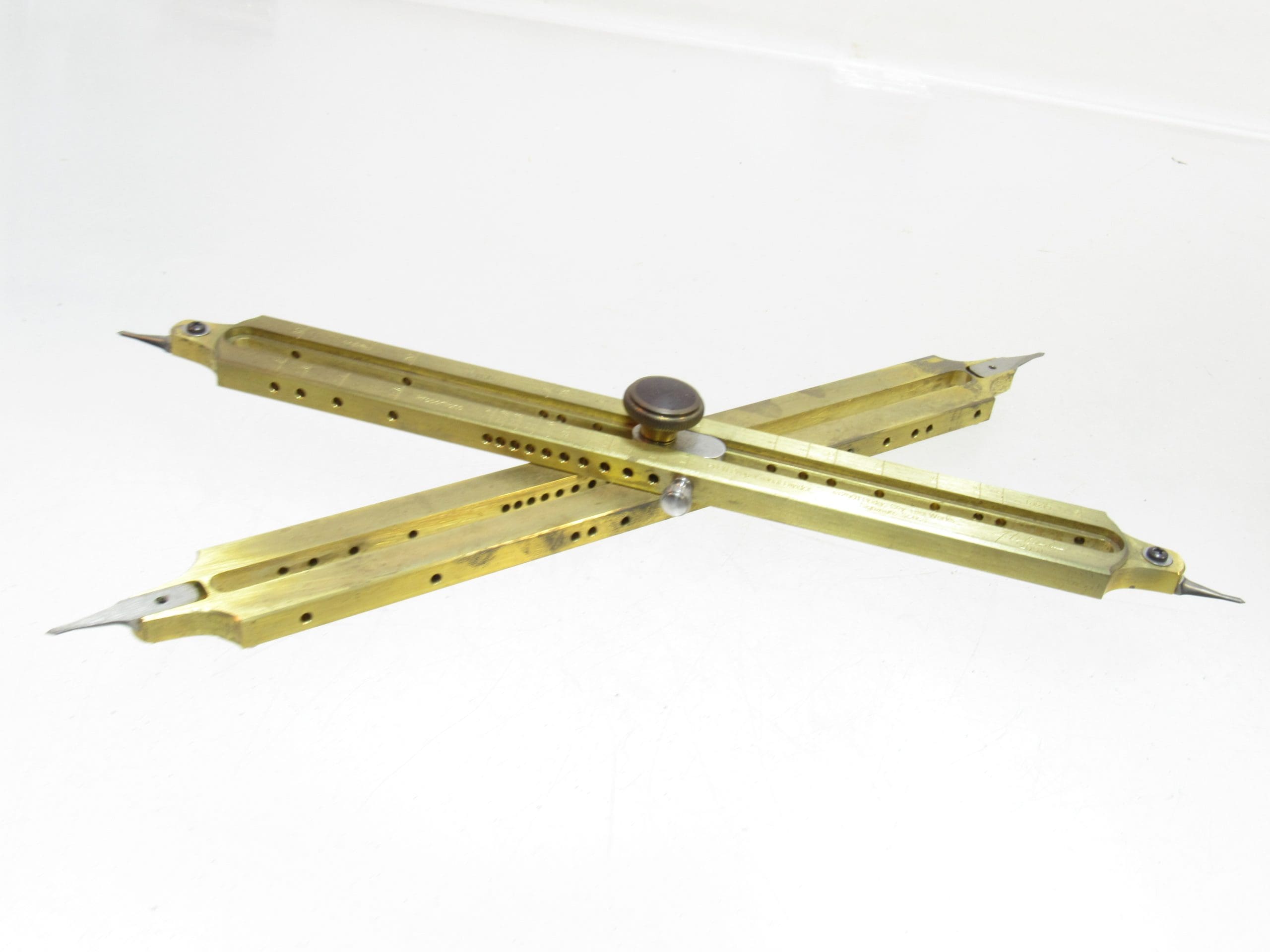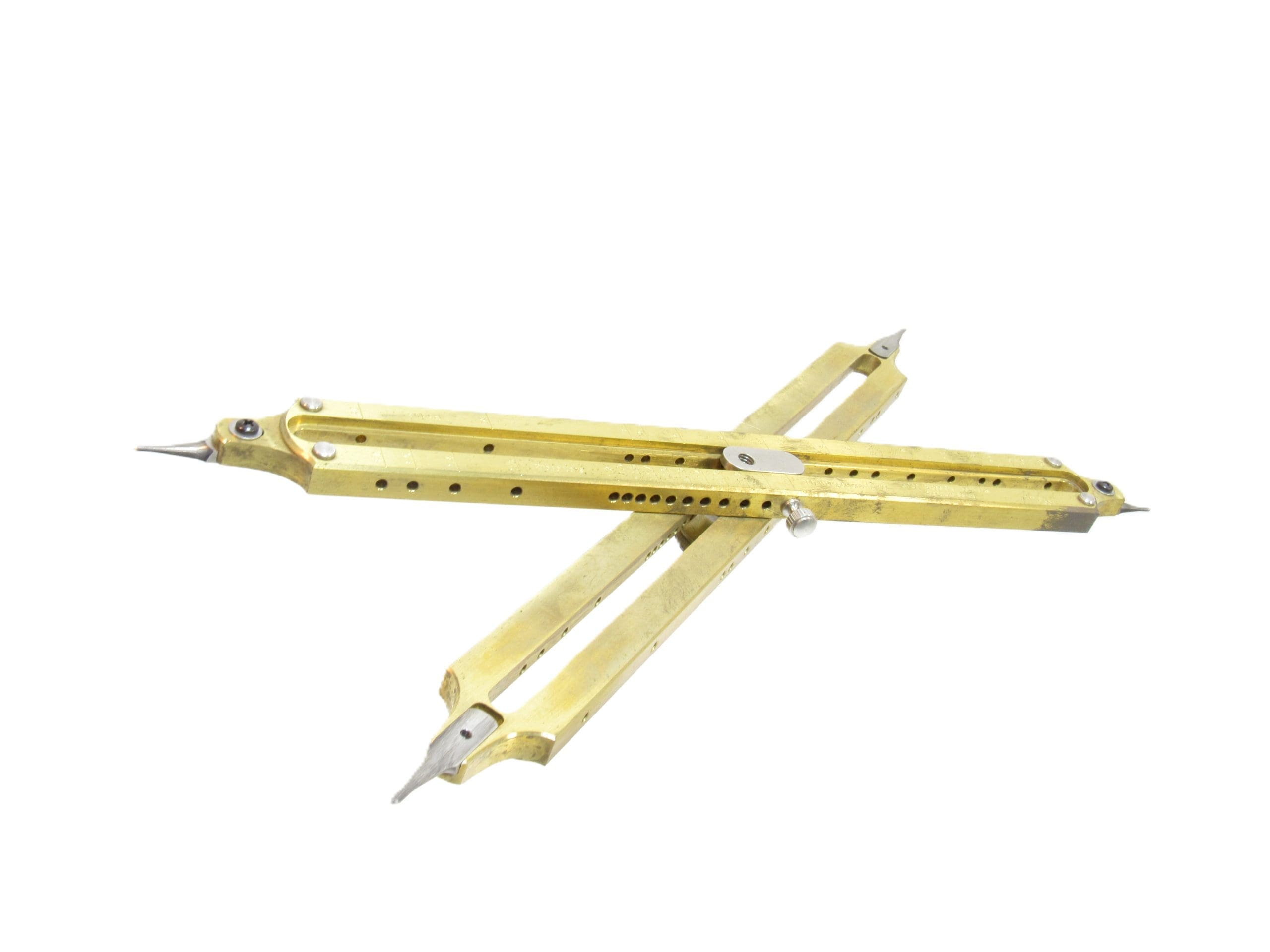 The stainless steel pivot mechanism is a “sliding pivot” that positively indexes to the various holes in the divider arms with stainless steel locking screws. This design feature makes it impossible for the tool to give you misleading results. The accuracy of the tool is derived from the CNC machined holes and the adjustable points (an easy factory adjustment).