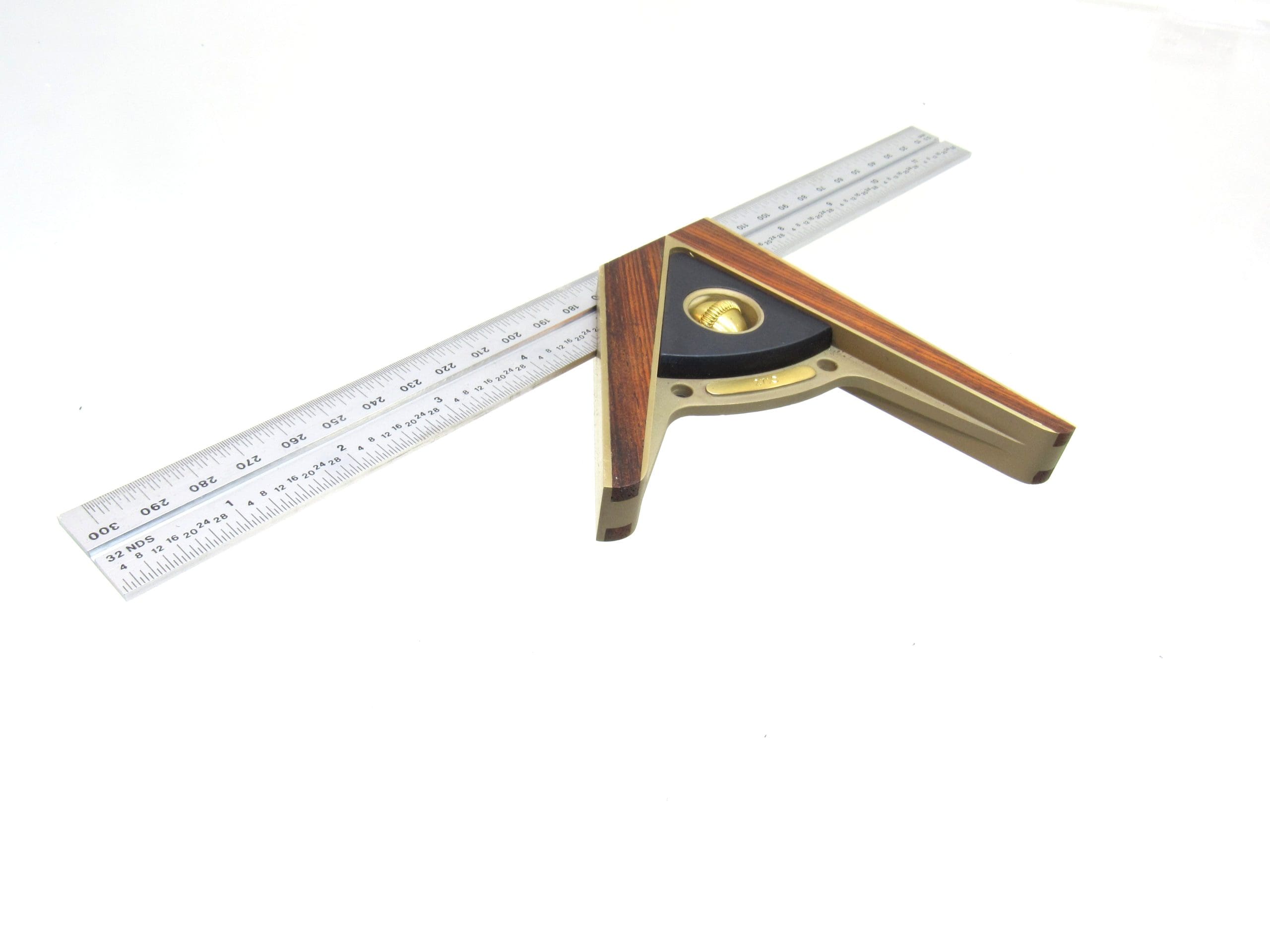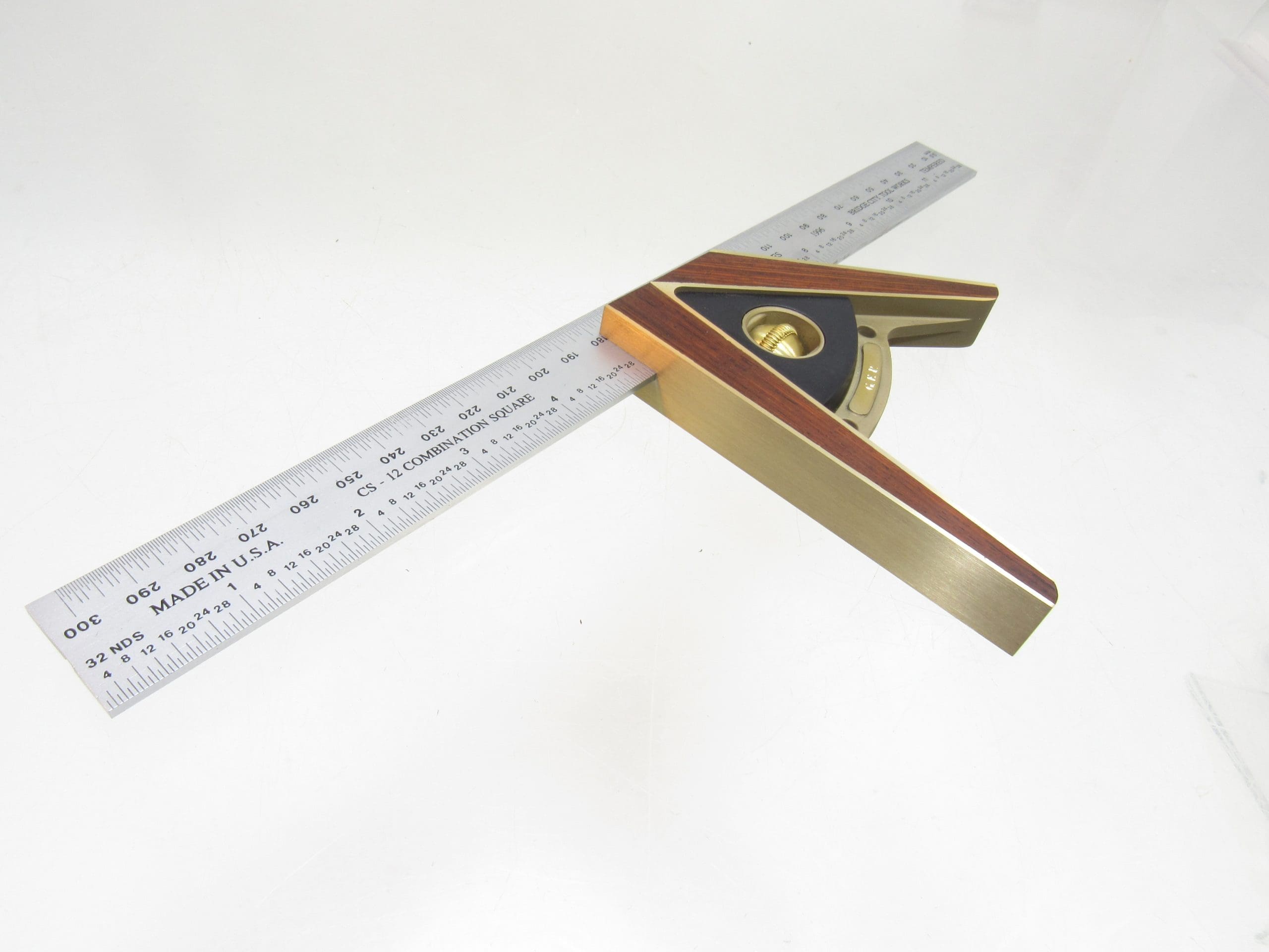 The 12-inch satin-chromed blade provides excellent readability, with graduations in both English and Metric, making it a versatile tool for fine woodworking and precision layout work. Additionally, this square has the common factory engraved initials, a characteristic detail of these limited-edition Bridge City tools.
