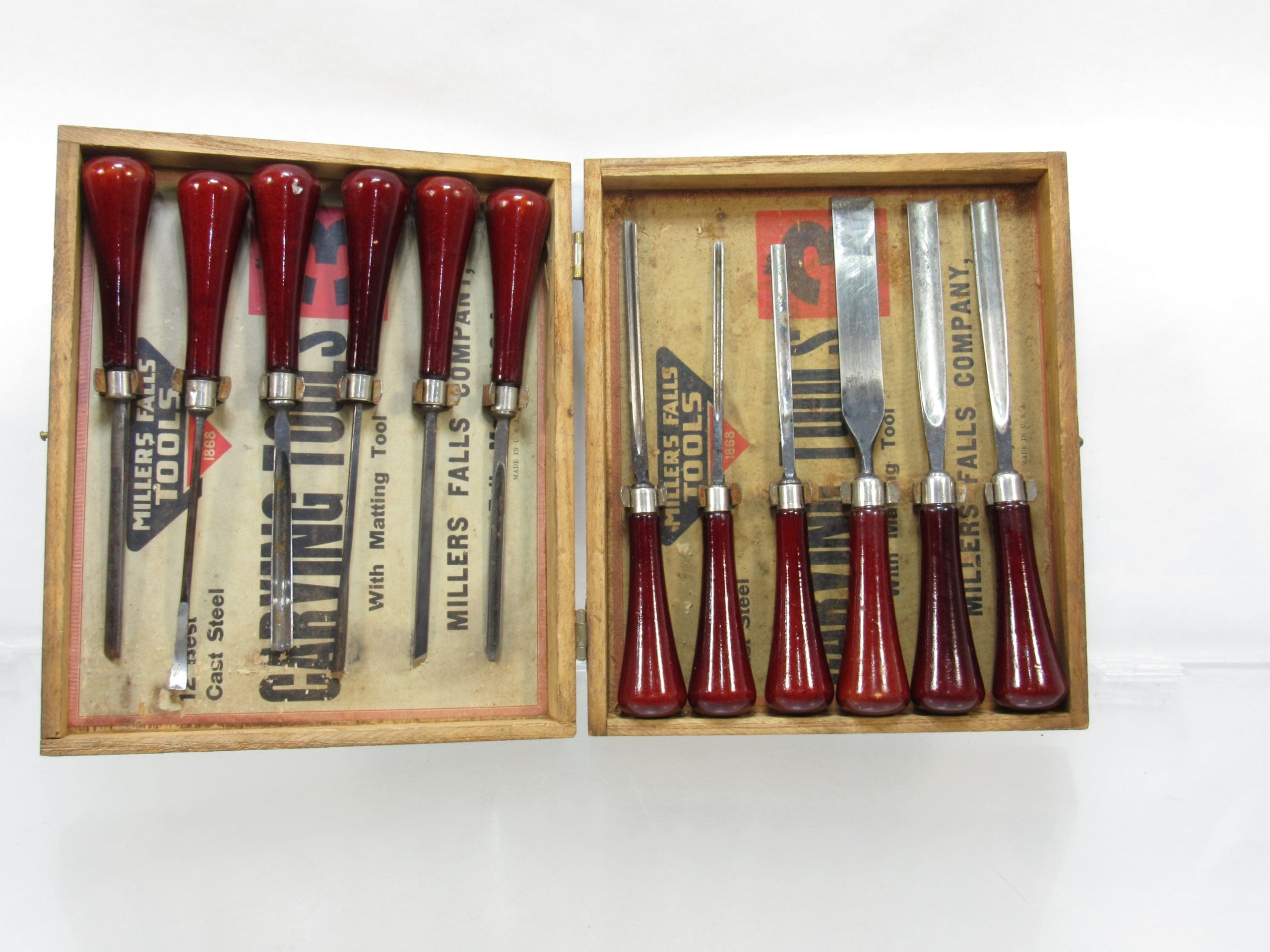 Fine In Box Millers Falls 12 Piece Carving Chisel Set In Original Wooden Box With Labels.