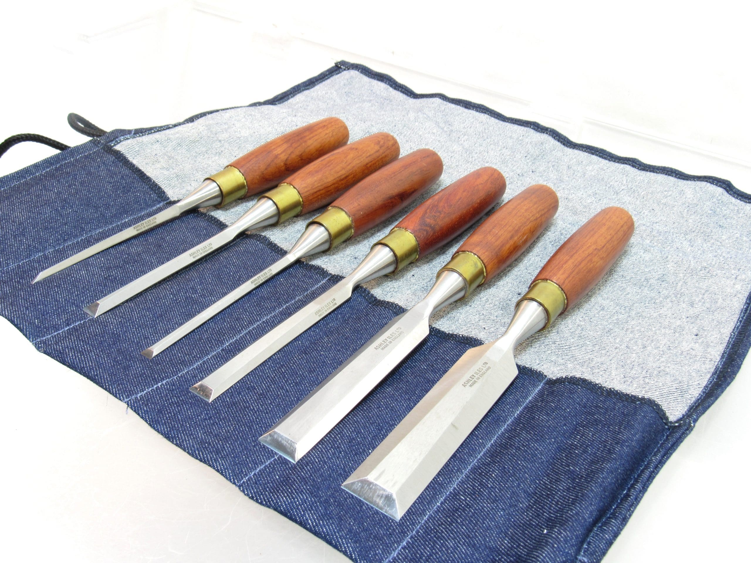 Superb Set of 6 Minty Ashley Iles Bevel Edge Chisel Scary Sharp And Flattened In Denim Roll.