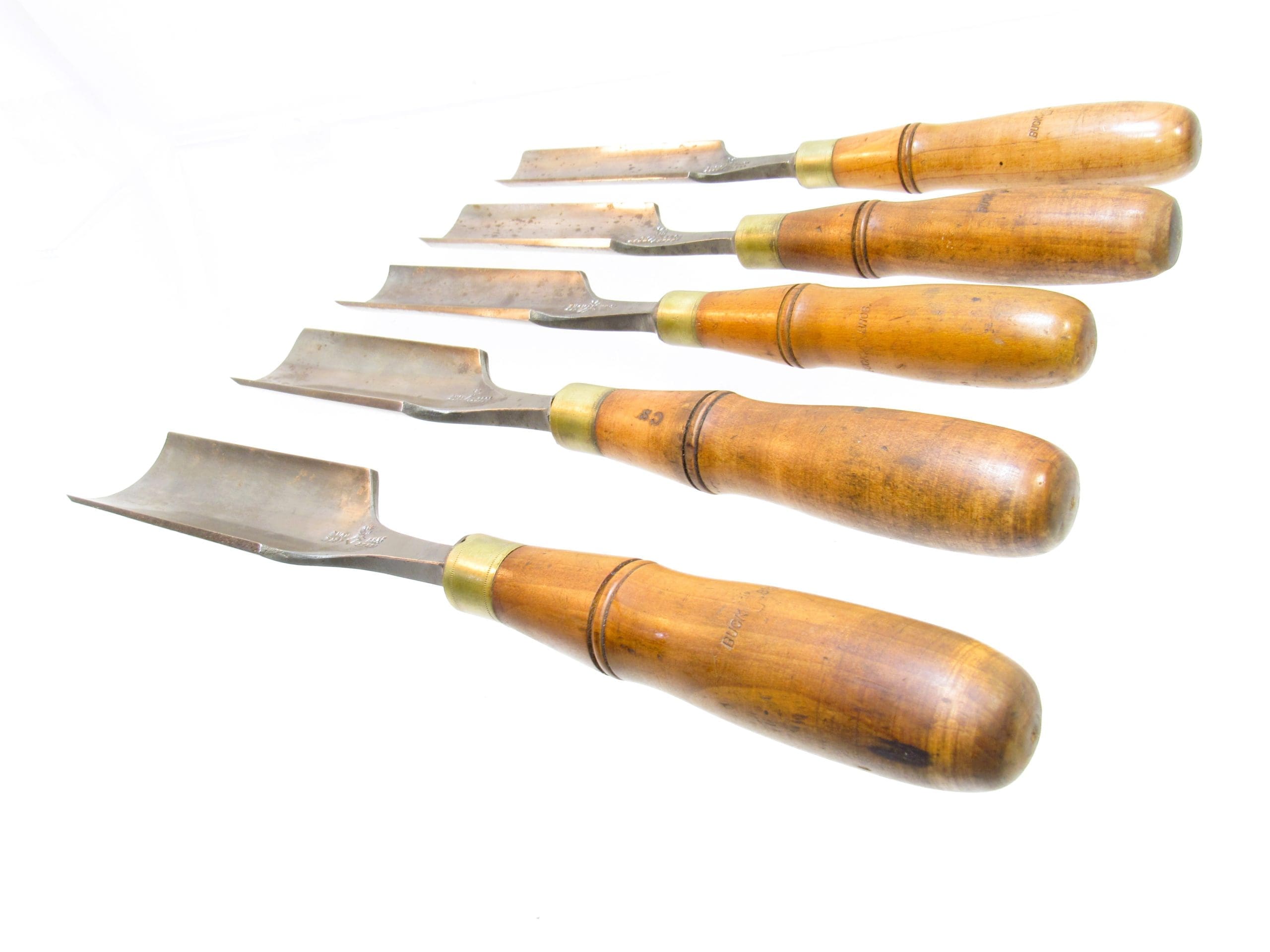 Large Set Of 5 Buck Brothers Cast Steel Gouge Chisels 2" 1 3/4" 1 1/2" 1 1/2" 1 1/4" @ 14" - 13" Long